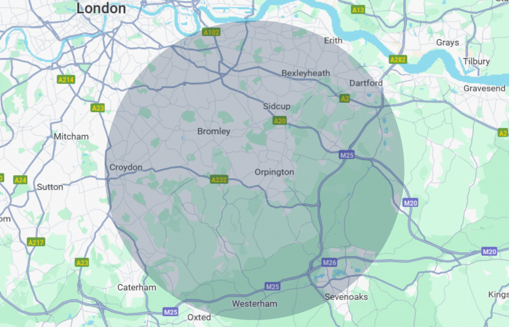 Beckenham, Bexley, Bexleyheath, Biggin Hill, Bromley, Chislehurst, Eynsford, Farnborough Village, Hayes, Keston, Knockholt, Locksbottom, Orpington, Otford, Petts Wood, Sevenoaks, Sidcup, Swanley, West Kingsdown, West Wickham, Welling, Wrotham